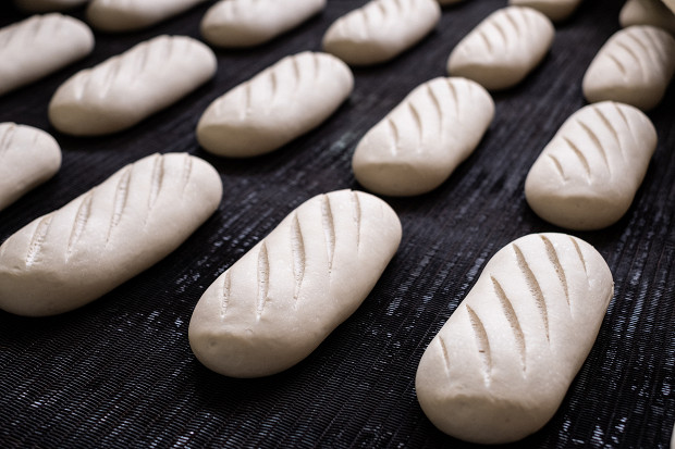 Отдохнув, тестовые заготовки отправляются в закаточную машину, где их сначала раскатывают в тонкий блин, а затем быстро сворачивают в рулет, отчего булочка приобретает продолговатую форму, отдаленно напоминающую гантель. Затем по транспортеру сформованные автоматическим укладчиком тестовые заготовки попадают в люльку расстойного шкафа, где им предстоит провести час при температуре 38 градусов и влажности 60%. Процесс брожения продолжается, батончики поднимаются и увеличиваются в размерах.