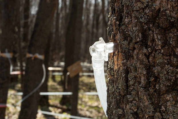 Летом, осенью и зимой сок не варят. Но заняться есть чем. Из одного отверстия сок течет только раз, поэтому все 20 тыс. кленов нужно обойти, проверить и просверлить заново. Старое отверстие к концу лета начнет зарастать, а через пару лет его никто и не заметит. Занимаются этим всего 20 человек — два года назад они за три месяца смонтировали всю систему (напомню - это 100 км сокопровода с развязками). Для сравнения, в Канаде на подобную работу уходит почти год.