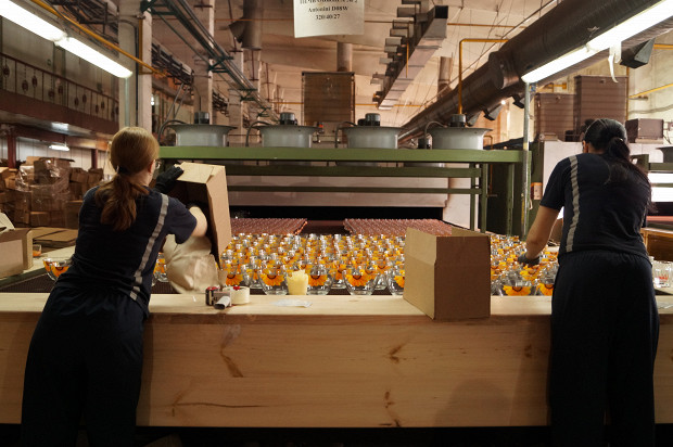 И еще цифра — здесь вообще любят цифры, объемы, воплощения. ОСЗ — единственный завод в России, который сейчас производит граненые стаканы. Самое первое, о чем говорят здесь про них, — даже не число граней, обросшее различными мифологическими трактовками. А то, что высота «Рабочего и колхозницы» Веры Мухиной (Мухина и стакан спаяны уже крепко-накрепко, не разбить) — это 476 граненых стаканов, составленных один в один.