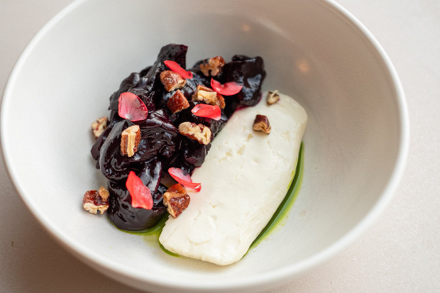 Сложно полюбить вареную свеклу — знаю по своему опыту: в ее вкусе содержится все, что я не люблю. Это блюдо — попытка приготовить свеклу так, чтобы она стала вкуснее, чтобы ее было не стыдно подать в ресторане. Я понял, что, если отварную свеклу подвялить, она поменяет текстуру, станет более упругой. По консистенции и вкусу (да и внешнему виду) дольки свеклы начинают напоминать чернослив. Это очень интересный эксперимент, попробуйте!