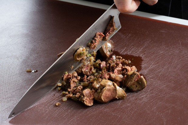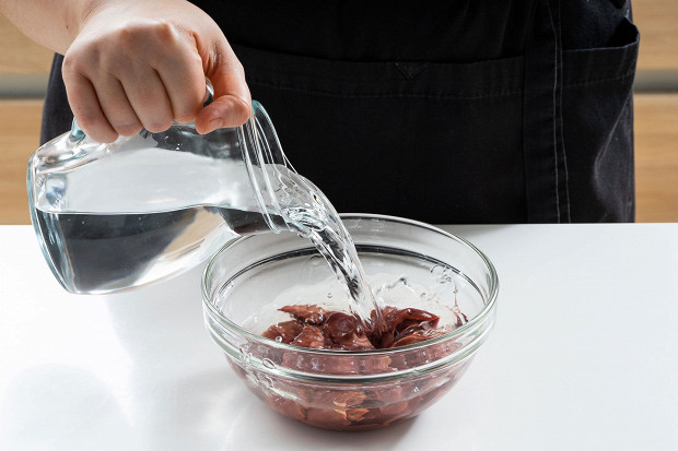 Грамотный сэндвич строится из четырех базовых элементов: мясо/рыба, овощи, соус и, условно, масло или другая намазка. В бань-ми роль намазки играет куриный паштет. Вот с него и начнем, поскольку готовится он дольше всего остального и ко времени сборки сэндвича должен будет полностью остыть. На каждую порцию сэндвича вам понадобится 2 куриных печенки. Избавьте их от всего лишнего — крови, сосудов и прожилок, залейте водой и оставьте на 15 минут, чтобы гарантированно убрать горечь.