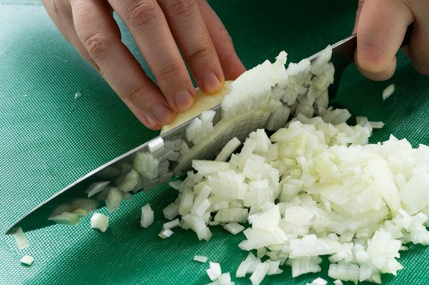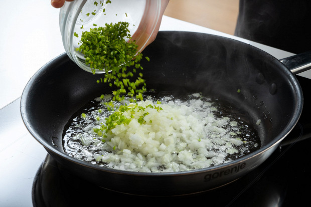 Тем временем нарежьте мелкими кубиками 1 луковицу, возьмите небольшой пучок кинзы, оборвите листочки и пока отложите, а стебли мелко порубите. Поставьте сковороду на средний огонь и разогрейте в ней 30 мл растительного масла.