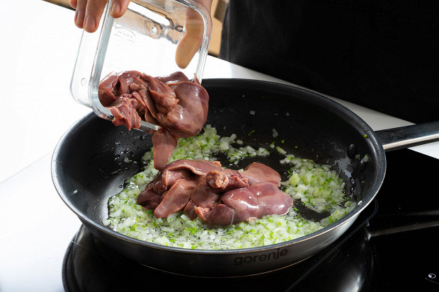 Печень достаньте из воды, хорошенько обсушите бумажными полотенцами, киньте на сковороду и жарьте, время от времени помешивая и переворачивая, 10 минут. Печень должна прожарится без крови, но остаться чуточку розоватой и мягкой внутри: ее состояние надо проверить, надрезав кусочек.