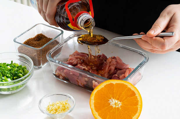 Второй элемент начинки — свинина. Тут подойдет кусок с жировыми прожилками, окорок или шея. 200 грамм мякоти нарежьте тонкими ломтиками, выложите в миску и залейте маринадом, смешанным из 2 столовых ложек соевого соуса (лучше брать легкий соус с уменьшенным количеством соли), 2 столовых ложек апельсинового сока, 1 столовой ложки рыбного соуса и 1 чайной ложки тростникового сахара. Мелко нарежьте 3 зубчика чеснока, зеленого лука и тоже добавьте в соус. Оставьте свинину в покое на 5–10 минут.