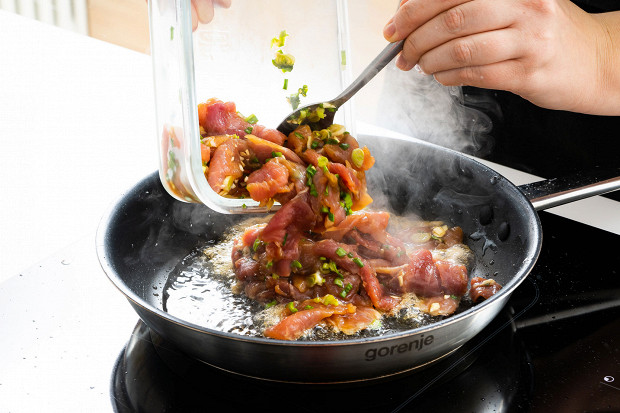 Хорошо разогрейте сковороду с небольшим количеством растительного масла, выложите на нее свинину вместе с маринадом и жарьте до готовности 7 минут. Свинина должна полностью приготовиться и покрыться золотистой корочкой.