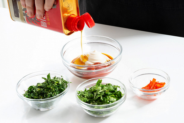 Займитесь соусом: небольшой пучок мяты порубите вместе с оставшимися листьями кинзы. Смешайте зелень с 4 столовыми ложками майонеза, 1 столовой ложкой соевого соуса, 1 столовой ложкой кетчупа. Если любите, добавьте 1 чайную ложку кунжутного масла. Туда же вмешайте очищенный от семян и тонко нарезанный перец чили — остроту регулируйте по своему вкусу. Соус посолите, поперчите и хорошо перемешайте.