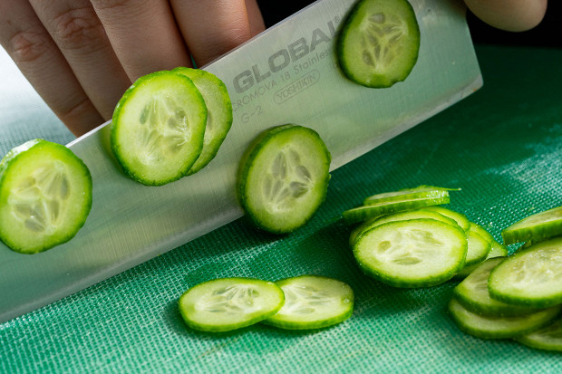 Последний элемент начинки — овощи. Нашинкуйте 150 грамм капусты тонкой соломкой, так же нарежьте 100 грамм морковки. 100 грамм свежих огурцов нарежьте тонкими кружочками.