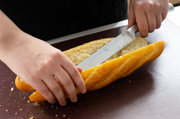 Когда все составляющие сэндвича будут готовы, багет надрежьте по всей длине (но не дорезайте до конца) и прогрейте на гриле.