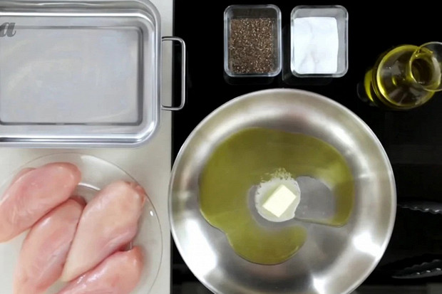Куриные грудки посолите, поперчите. Разогрейте в сковороде 2 столовые ложки оливкового и 1 столовую ложку сливочного масла, обжарьте грудки до золотистой корочки. Переложите в форму для запекания.