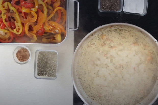 Подготовьте все ингредиенты. Вам понадобятся 4 куриные грудки без костей (из расчета на 4 порции), 2 луковицы, 3 сладких красных перца, 4 помидора, 3 зубчика чеснока, оливковое и сливочное масло, полстакана сливок и сыр, чтобы посыпать курицу сверху. А также специи: овощной бульонный кубик (он здесь, скорее, не ингредиент, а приправа), смесь итальянских трав, мускатный орех, соль и перец.