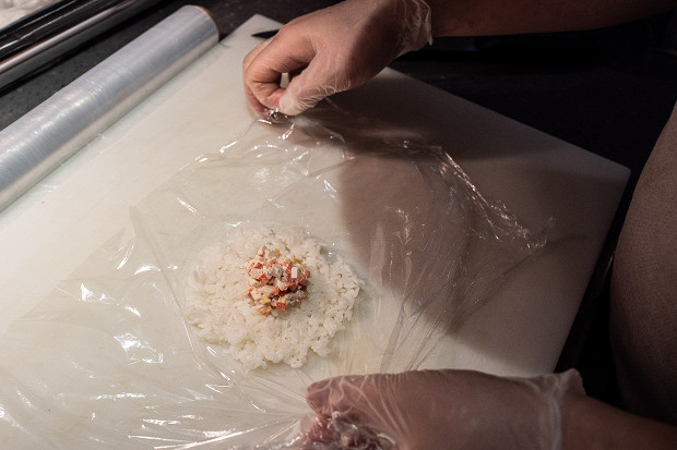 Аккуратно заверните начинку в рис через пленку, как в мешочек. Сформируйте для начала шарик.