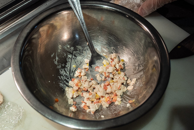 Второй вариант приготовления онигири — перемешивание начинки и риса.