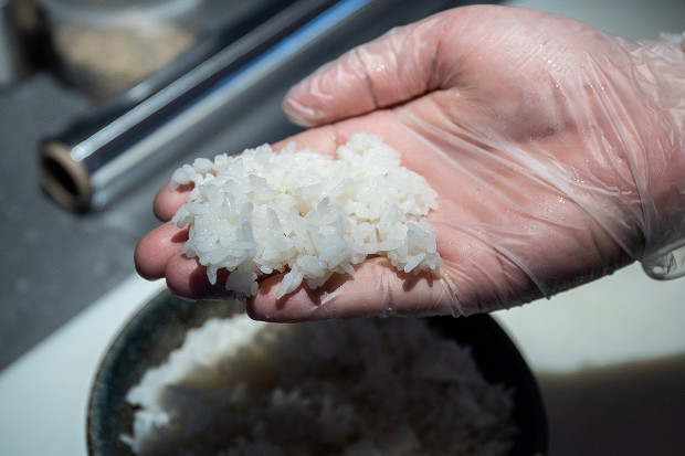 Если у вас заготовлен рис заранее, разогрейте его до 40 градусов. Если вы разогреваете рис в микроволновке, накрывайте его пленкой, чтобы он не подсох.