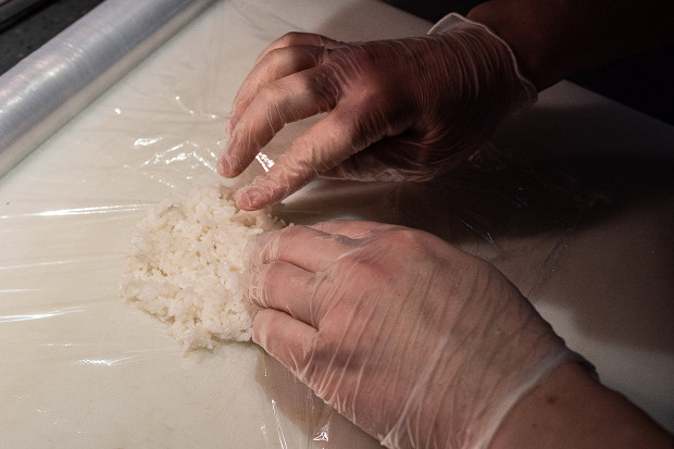 Расстелите пищевую пленку, выложите на нее 70 грамм теплого отварного риса, распределите его ровным слоем, не тонким.