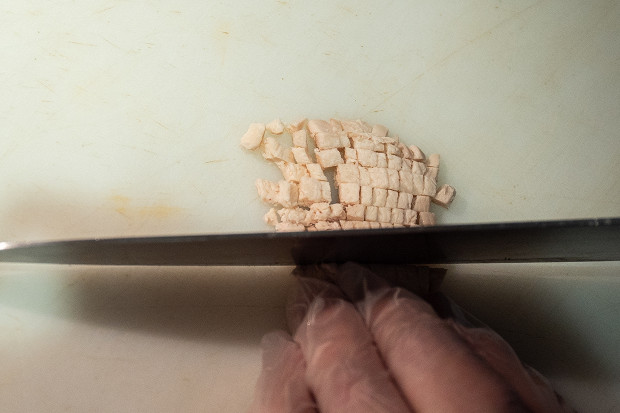 Итак, возьмите 30 грамм отварной куриной грудки, порубите ее мелким кубиком.