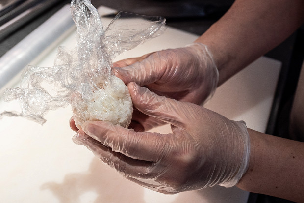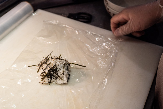 Онигири можно лепить руками, а можно при помощи пищевой пленки. Второй вариант проще, особенно если вы готовите впервые. Я его и покажу.