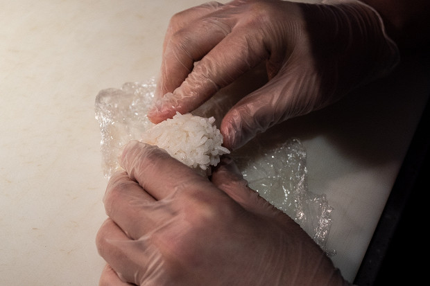 Снова заверните онигири в пленку, продолжайте аккуратными мягкими надавливаниями лепить. Мы сформовали треугольник, но вы можете оставить шарик, сделать кнели или все что угодно.