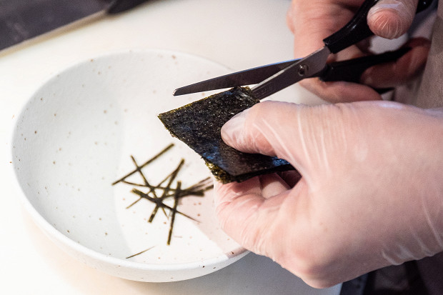 Отрежьте от листа сушеных водорослей нори полоску шириной 2,5–3 см, прилепите ее к онигири (она легко пристанет к рису). За нее онигири будет удобно держать.