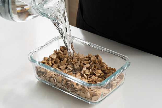 Для начала нужно замочить щепу в воде — так она не загорится внутри коптильни. Но если вы собираетесь просто подкоптить уже готовое блюдо для аромата, то этот шаг можно опустить. Щепу оставьте в воде примерно на 30 минут.
