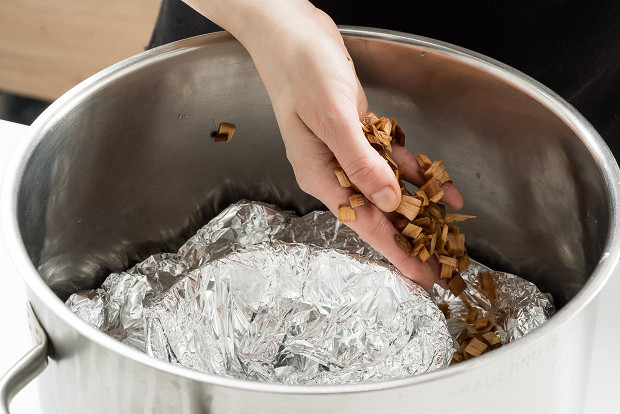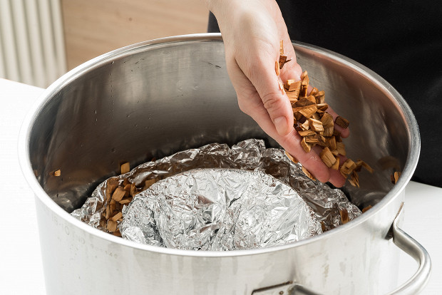 Установите миску на фольгу в центр кастрюли и обсыпьте ее щепой по кругу. Все щепки, которые попадут между слоем фольги и стенкой кастрюли, нужно убрать — они начнут гореть, да и кастрюлю отмыть будет гораздо тяжелее.