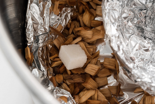 На опилки выложите 6–8 кусочков сахара. Сахар отвечает сразу за три аспекта — впитывает жидкость, которая будет выделяться из рыбы, дает красивый цвет и аромат.