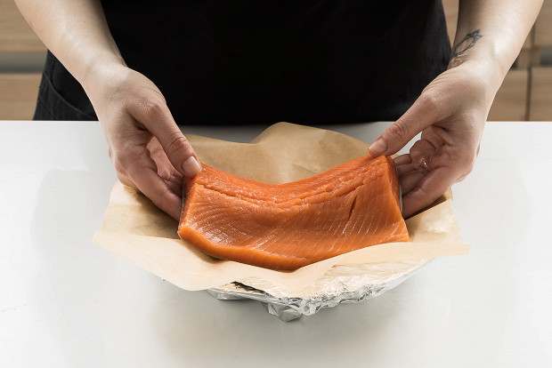 На тарелку, обернутую фольгой, положите кусок пергамента, иначе рыба прилипнет. Рыбу предварительно нужно подготовить — удалить крупные кости и замариновать в солевом растворе с сахаром и специями. А вот кожу лучше оставить. На 500 миллилитров воды возьмите 100–150 грамм соли и 100 грамм сахара, все перемешайте. Залейте подготовленное филе маринадом и оставьте в холодильнике на пару часов. Если торопитесь, то просто посолите рыбу. У нас кусок весом примерно 300 грамм.
