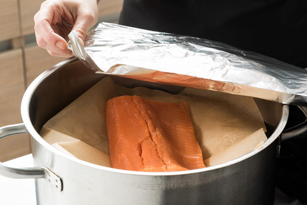 Через 15–20 минут рыба будет готова. Самое время включить вытяжку на максимум — когда откроете крышку, из кастрюли повалит дым. И еще открывайте коптильню предельно аккуратно, дым и фольга очень горячие.