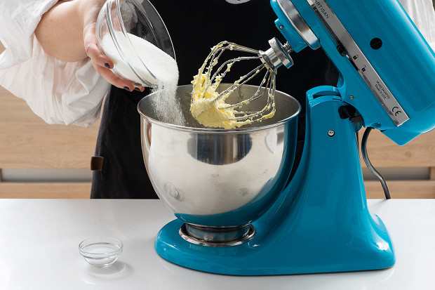 Добавьте в дежу миксера 200 грамм сахара и щепотку соли, взбивайте на средней скорости еще 3 минуты. Все ингредиенты должны равномерно перемешаться.