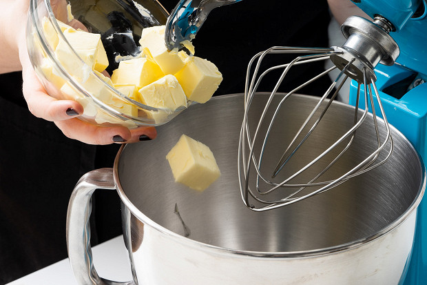 Порубите 300 грамм размягченного сливочного масла на кубики, переложите в миксер и взбивайте насадкой венчик на средней скорости в течение 2 минут, за это время масло станет кремообразным.