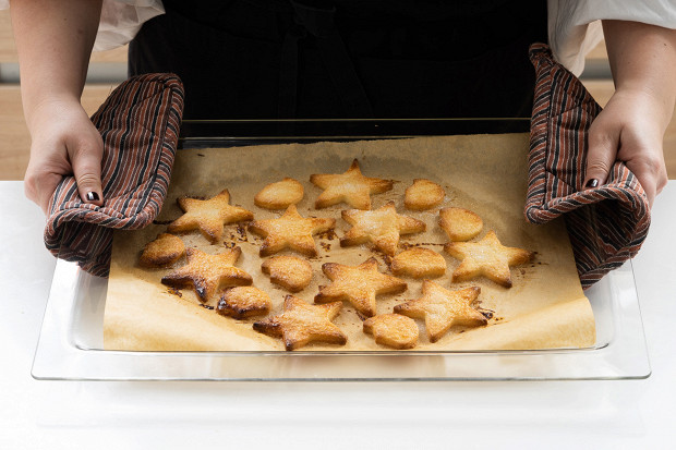 Переложите печенье на бумаге на противень, отправьте в духовку, разогретую до 230 градусов, на 10 минут.