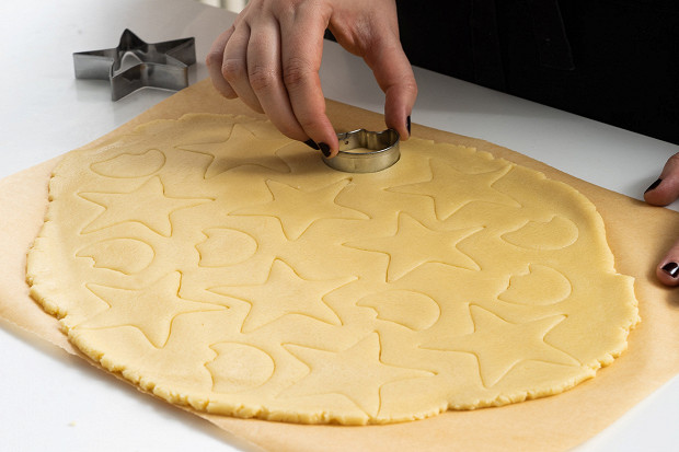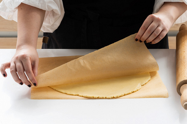 Положите тесто между двумя слоями пергамента, раскатайте скалкой тесто в пласт толщиной 4 мм.