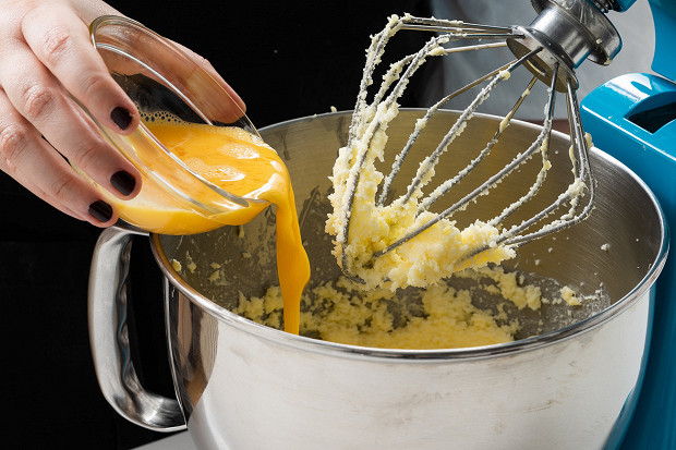 Добавьте 70 мл меланжа и перемешайте на средней скорости. Перемешивайте, пока масса не станет полностью однородной.