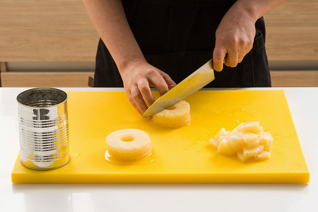 Сам консервированный ананас нарежьте кусочками в 1,5 см.