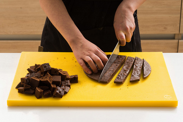 Теперь вернитесь к коржам и нарежьте два из них крупными кубиками в 2–3 см.