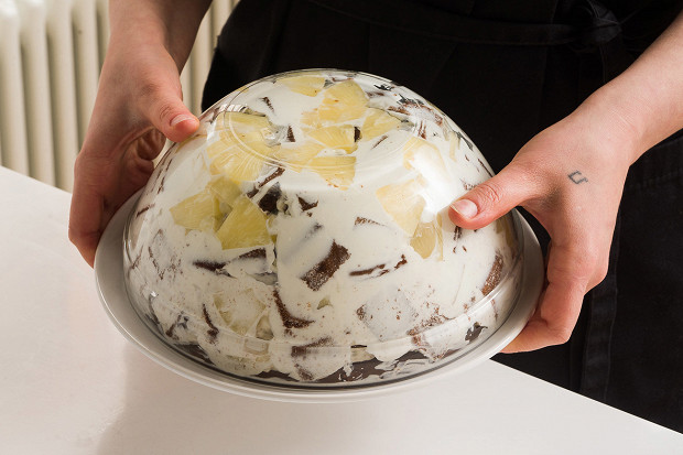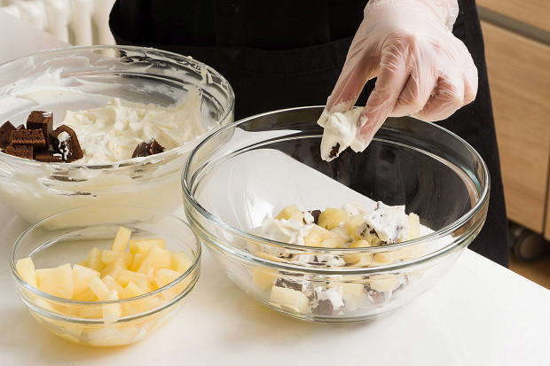 Выложите в круглую миску кусочки ананаса, перемежая нарезанными коржами, предварительно окунув кусочки коржей в крем (это удобно делать щипцами, палочками для суши или руками в перчатках). Примерно полстакана крема у вас должно остаться, сразу уберите его в холодильник.