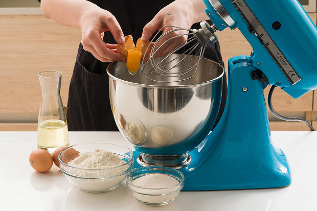 Сначала займитесь бисквитными коржами. Но готовить мы их будем не в духовке, а на сковороде. Смешайте в чаше миксера 3 яйца, 100 мл растительного масла и 150 г сахара. Постепенно введите просеянную муку.