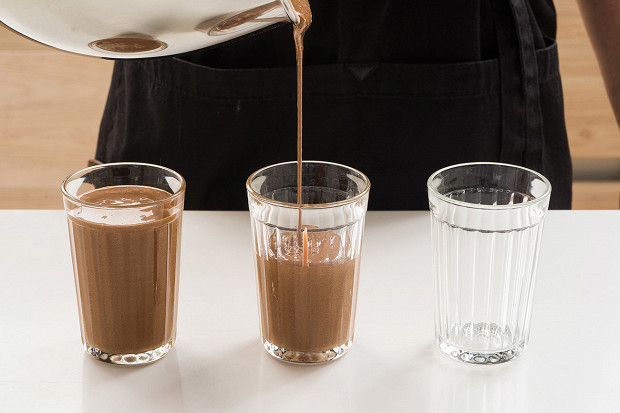 Разлейте жидкое тесто в три стакана — это будут заготовки для коржей.