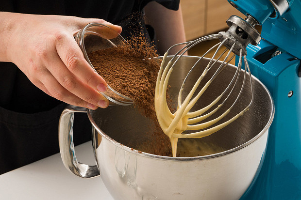 Добавьте в получившуюся массу по ½ столовой ложки соды и уксуса, 50 г порошка какао и щепотку соли. Соду уксусом гасить не надо — тогда вся ее «подъемная» сила будет не в ложке, а в самом тесте.