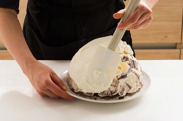 Когда крем застынет, достаньте торт, снимите аккуратно миску, обмажьте его при помощи шпателя или ложки оставшимся кремом.