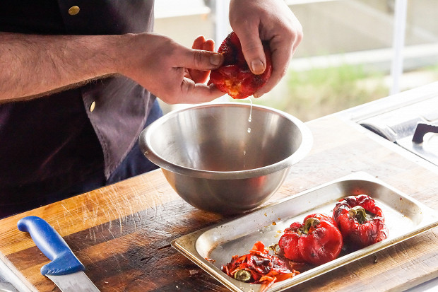 Сначала займитесь маринадом, он требует времени для приготовления. На 4 порции шашлыка вам понадобится 800–900 грамм сладкого болгарского перца. Поскольку шашлык маринуется, как правило, дома перед выездом, то проще воспользоваться духовкой: перцы вымойте, выложите в один слой на противень, запекайте в разогретой до 200 градусов духовке 20–25 минут. Они должны стать абсолютно мягкими, и не бойтесь черных подпалин — так и должно быть, кожу вы счистите, аромат огня останется.