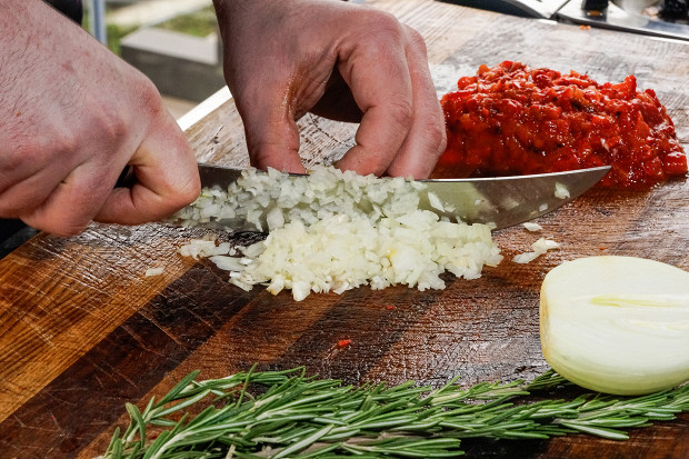 С пары веточек розмарина оборвите листики, мелко их нарежьте и добавьте к перцу.