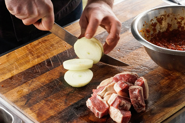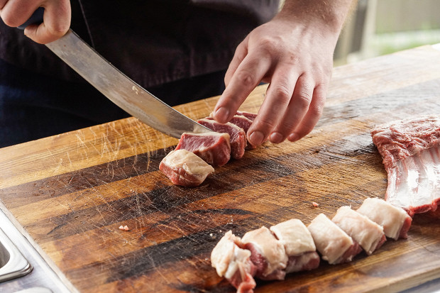 Нарежьте мякоть кусками величиной около 5 см — пусть они будут как можно больше похожи на кубики, и чтобы на каждом куске было немного жира.