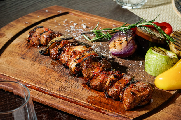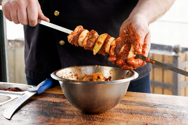 Мариновать мясо для шашлыка надо чуть-чуть. Причем настолько, что можно делать это прямо перед выездом — пока будете ехать до места, устанавливать мангал, пока угли разгорятся, пройдет полтора-два часа, будет как раз готово. На мой взгляд, цель маринада — это не размягчить мясо, а снабдить его дополнительным вкусом. Вино, уксус для баранины грубоваты: вино сушит мясо, а уксус делает его дряблым, лишает вкуса (но тут я не претендую на то, что мое мнение единственно верное, весь Кавказ считает вино и баранину идеальной парой, и спорить со всем Кавказом я не решусь). А еще я не сторонник, когда на шампур нанизывают, помимо мяса, еще и целый лоток овощей — помидоры, перцы, картошку. От влажных овощей само мясо напитывается влагой и на мангале будет не жариться, а вариться — это не тот вариант, который нам нужен. К тому же время приготовления у мяса и овощей разное. Поэтому стоит ограничиться луком, хорошенько закрепив его на шампуре. Он придаст мясу богатый аромат, и оно не будет нуждаться в большом количестве специй.