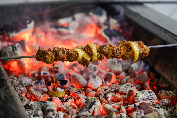 Шашлык готовьте на хорошо прогоревших, «седых» древесных углях. Жар должен быть равномерным, поэтому перед тем, как класть на мангал шашлык, хорошенько разбейте крупные угли. И запаситесь бутылкой с водой — чтобы сбивать пламя, если такое случится.