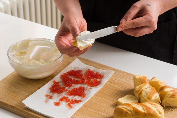 Соберите бутерброд. Намажьте на бриошь или багет сливочный сыр, а сверху — икру. Готово!