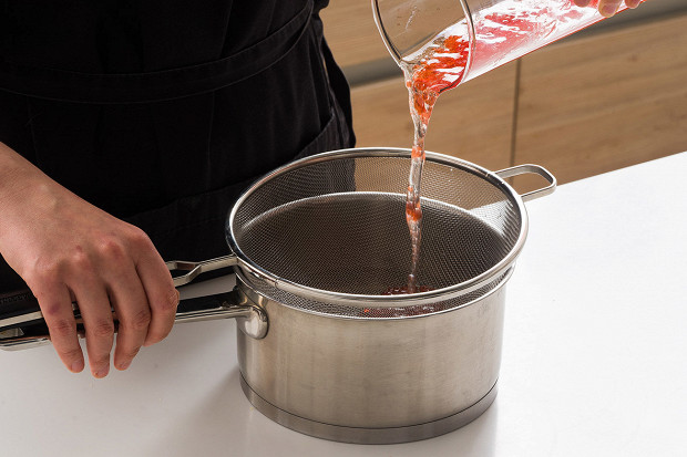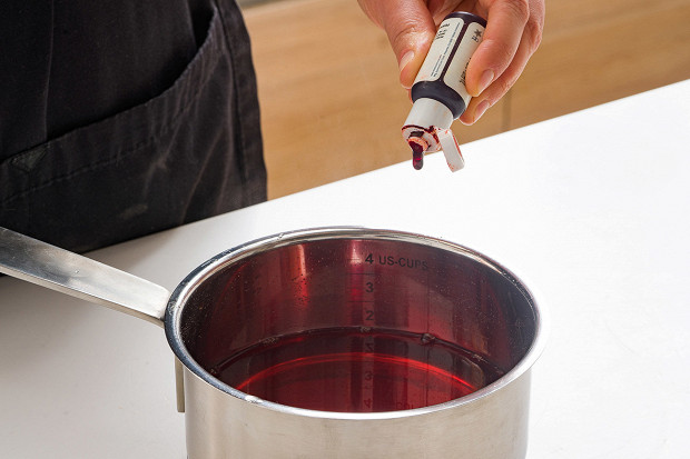 Добавьте несколько капель красного пищевого красителя, чтобы смесь в сотейнике приобрела лососевый цвет. Дайте жидкости остыть.