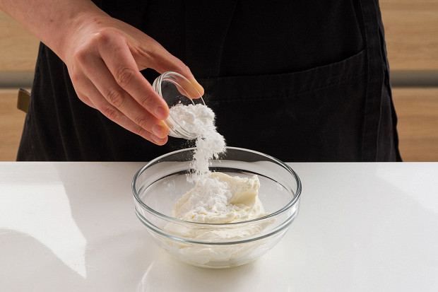 Теперь настало время подготовить «масло». Смешайте 150 грамм сливочного сыра и сахарную пудру. Пудру добавляйте по вкусу. Если вы хотите более десертный и сладкий вариант — добавьте больше.