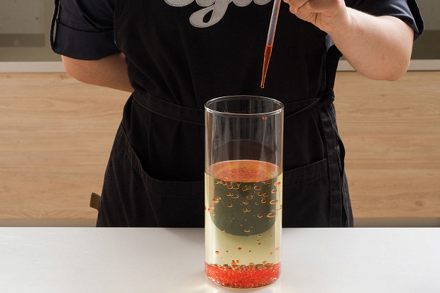 Наберите жидкость в пипетку и по капле выдавливайте ее в холодное масло. Дайте каждой капле время сформироваться и остыть. Не торопитесь.