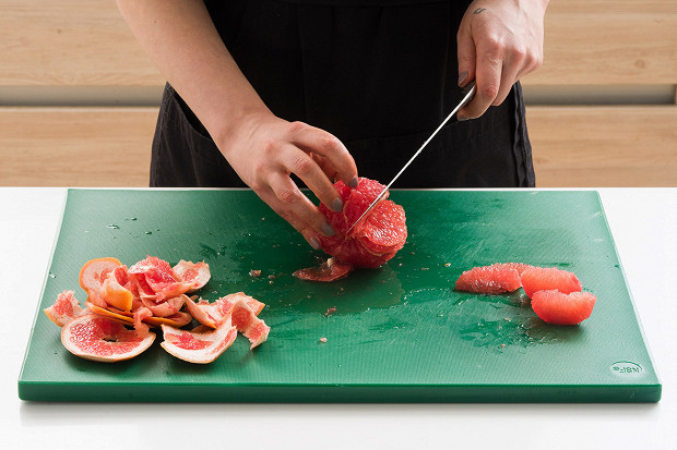 Грейпфрут очистите от кожуры и вырежьте сегменты долек без пленок.
