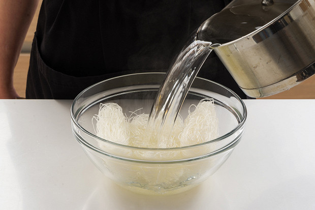 Фунчозу (110 г на 4 порции салата) замочите в кипятке на 4 минуты. Воду слейте, лапшу промойте холодной водой и переложите в глубокую миску.